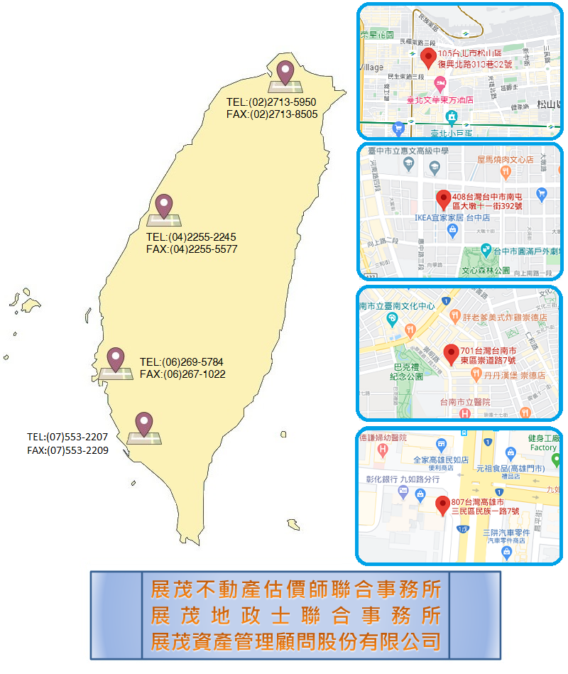 在事務所成立十年餘期間,累積大量的客戶且備受客戶的認同,遂即在民國105年09月成立「展茂資產管理顧問股份有限公司」,結合動產鑑價、無形資產評價及地政士業務,形成有形/無形資產估價服務及地政士業務全方位的專業服務,來滿足不同層次客戶的估價需求。並在台北、台南、台中、高雄成立聯絡處。